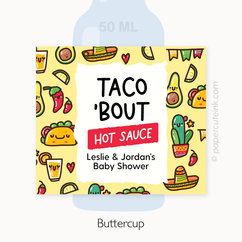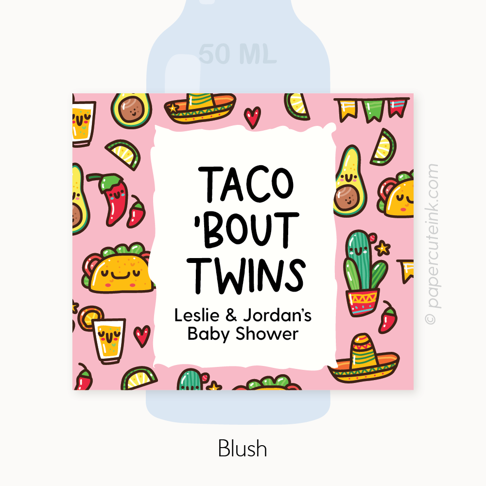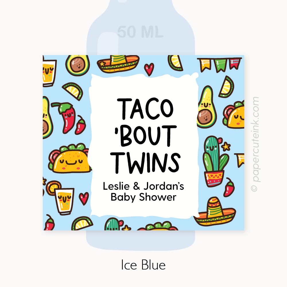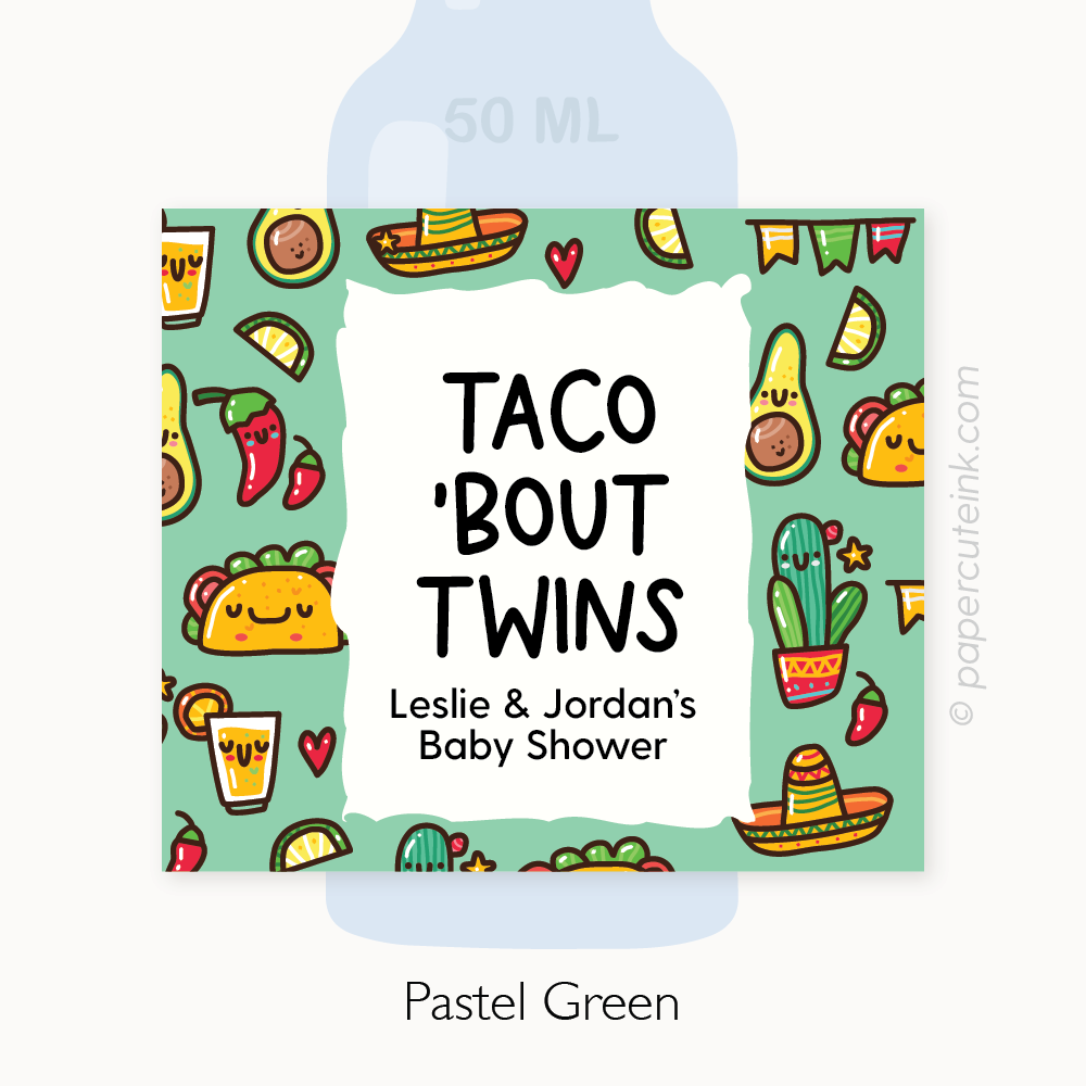 Taco Bout A Baby Fiesta Baby Shower favors. Mini bottle favors are sure to be a hit at your baby shower party. Easily fill with liquor or hot sauce to make custom favors your guests will love. Our taco bout a baby favor labels also double as baby shower table decor. Fill with your favorite cocktail, juice or hot sauce. Perfect for a coed couples baby shower. Available in several pastel pattern.