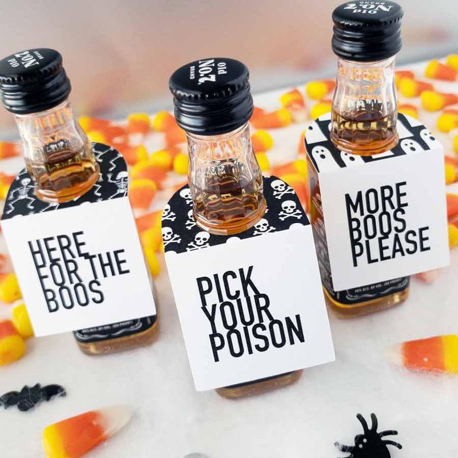 Halloween favor tags. Spooky Halloween party favor tags sized to fit miniature bottles of alcohol. Halloween party favor tags are perfect for Halloween table decorations. Add these spooky tags to a mini bottle of your favorite spirits for a Halloween favor that is guaranteed to be a hit with your guests!