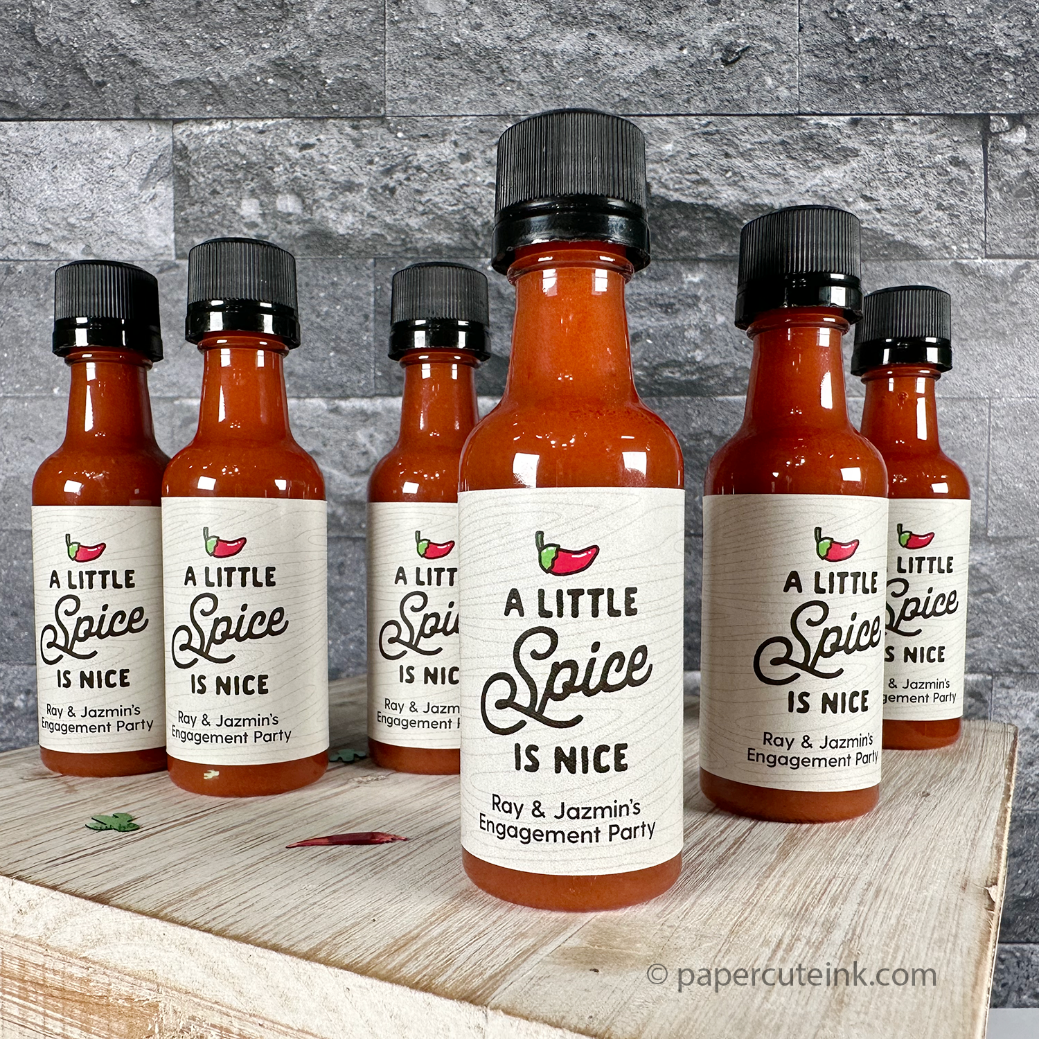 Add some heat to your wedding, anniversary party or engagement party with these hot sauce bottle labels. Hot Sauce labels feature red chili peppers and the phrase "One Hot Couple" or “A Little Spice is Nice”. This DIY kit allows you to easily make your own wedding party favors. Each 50ml bottle holds 1.6 oz of your favorite hot sauce or barbecue sauce. Mini hot sauce bottles make great guest favors and also double as wedding table decor. Also great as bridal shower or rehearsal dinner favors. Each label is personalized with the name of bride and groom.