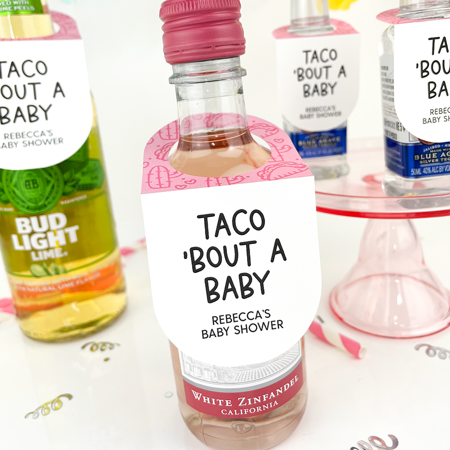 Taco bout a cutie baby shower favor tags. These mini bottle tags feature a fun taco and cactus pattern. You have the choice of 6 background colors. Add these fiesta inspired mini liquor tags to your favorite spirits creating a thank you gift your guests will love. Mini bottle tags are personalized with the name of the mom-to-be or add both parents names for a coed baby shower. Simply fold the bottle hanger tags and slip over the neck of your mini alcohol bottle.