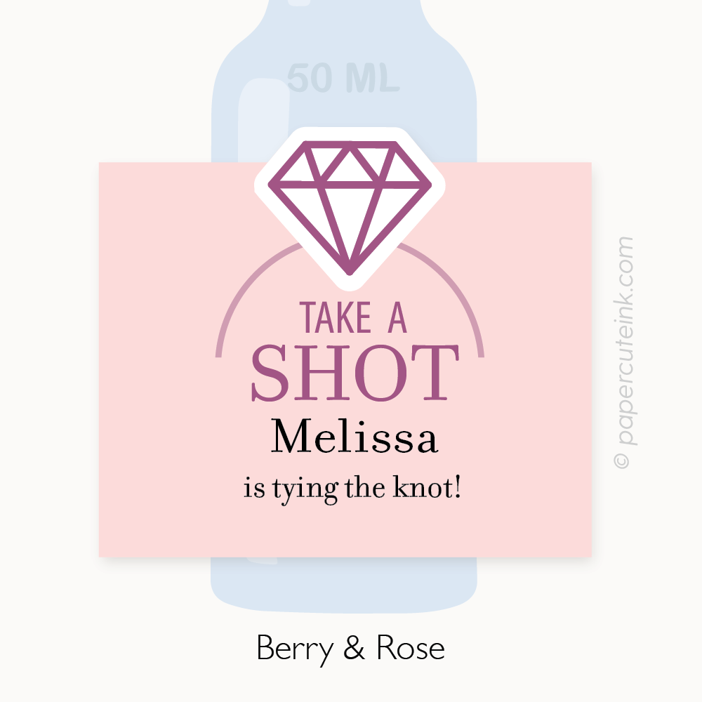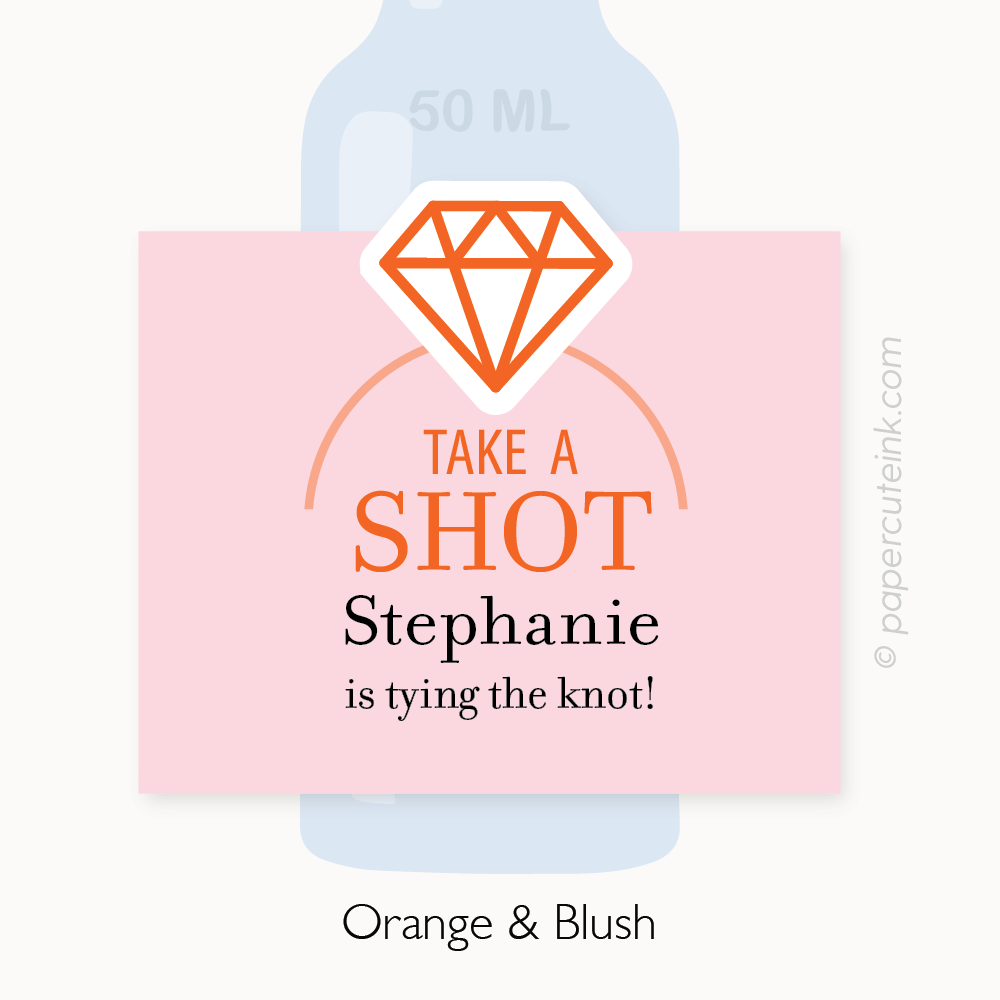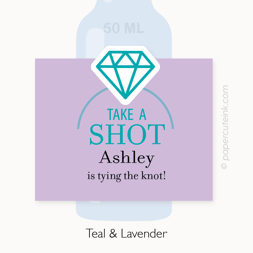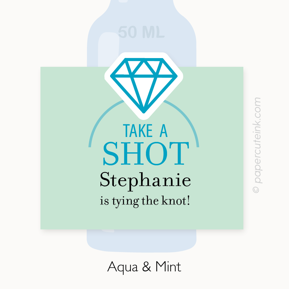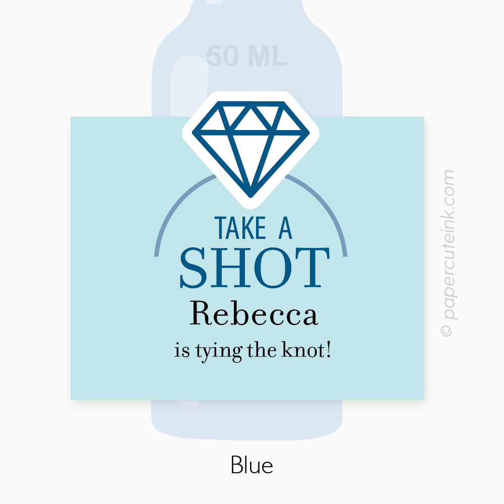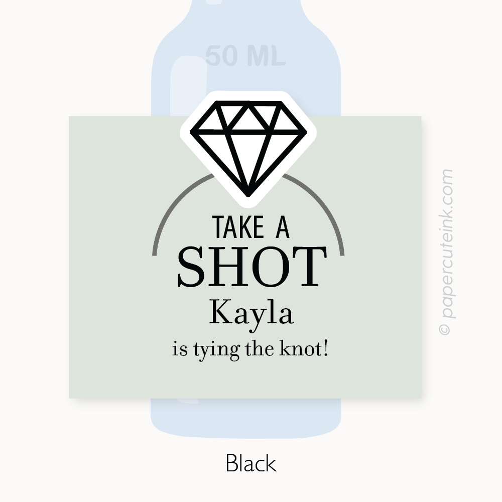 Take a shot she's tying the knot mini liquor bottle label favors. Perfect party favor for your bridal shower or bachelorette party. Each label features a diamond ring and a pastel color background. Mini liquor bottles make great guest favors and also double as table decor. Fill each mini liquor bottle with 1.6 oz of your favorite liquor or wine. Each label is personalized with the name of the guest of honor.