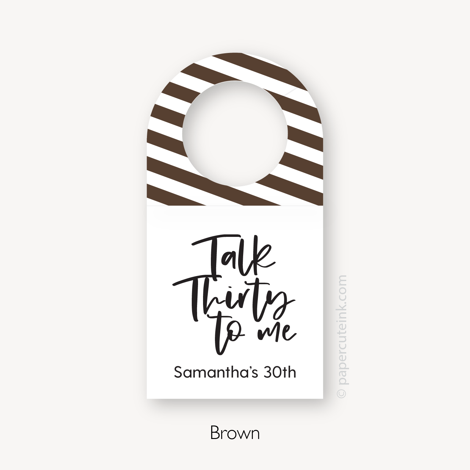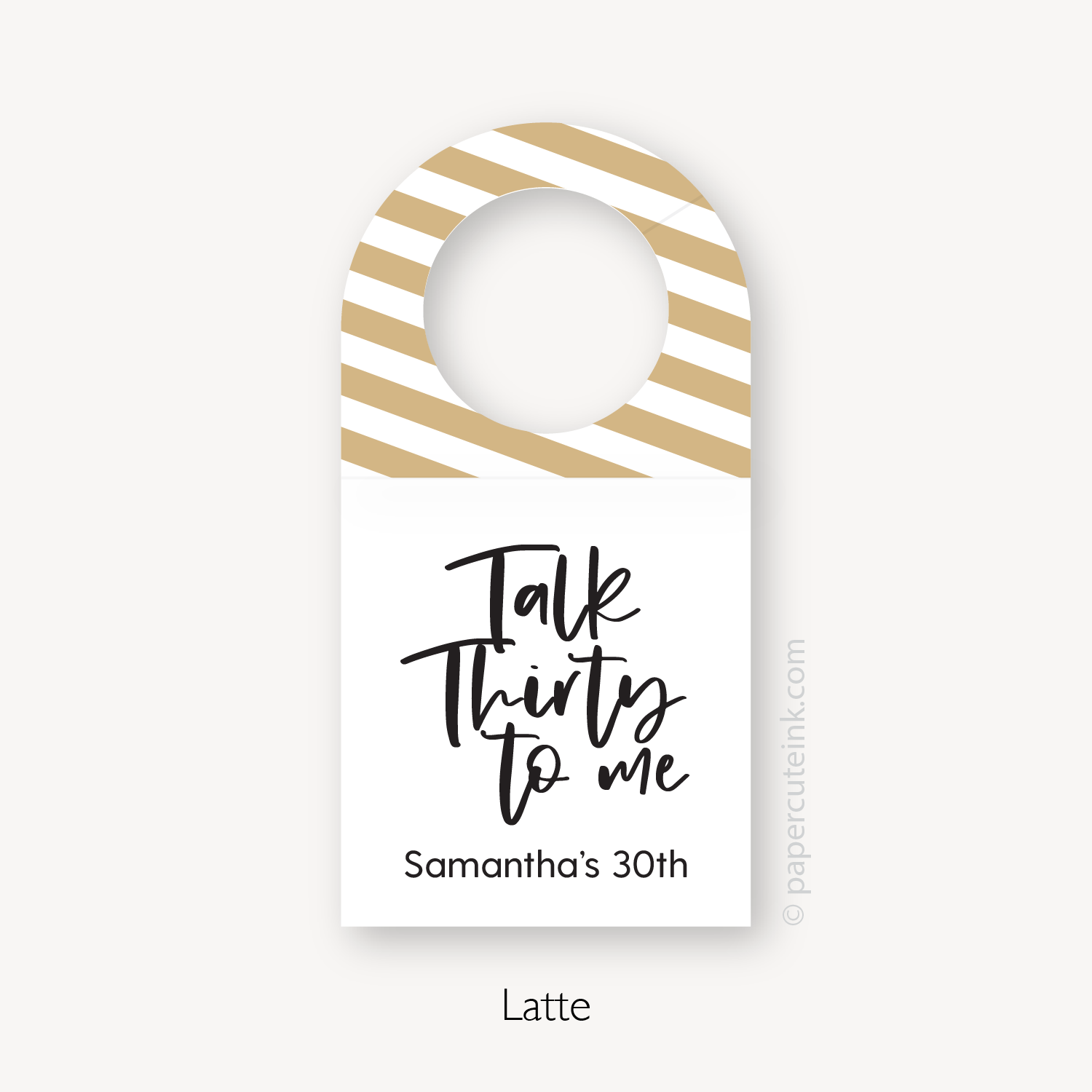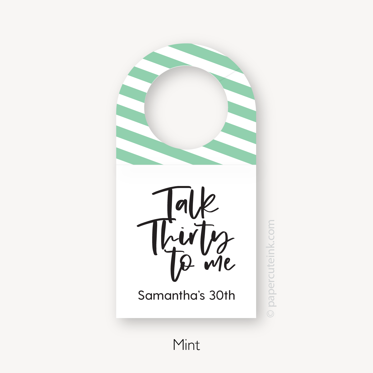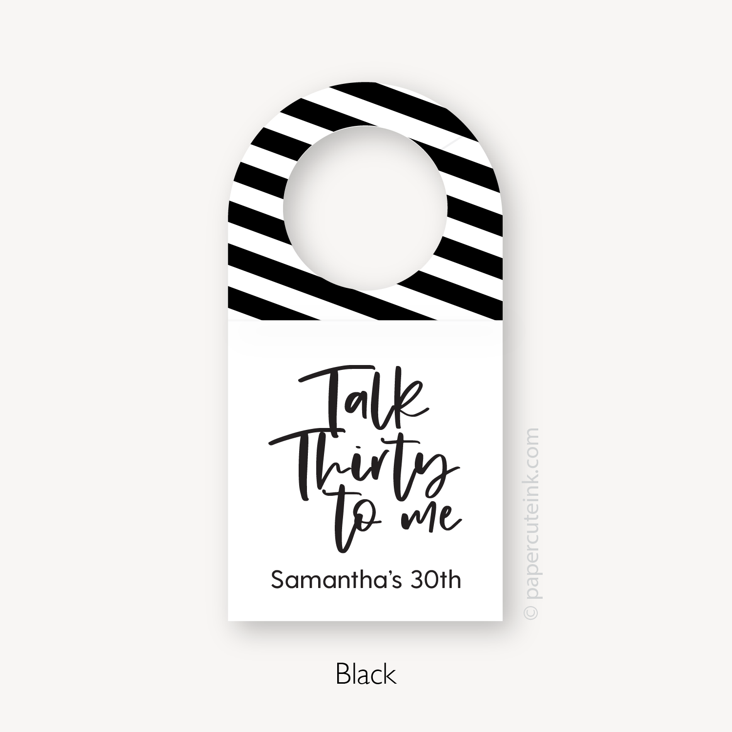 Talk thirty to me 30th Birthday favor tags sized to fit miniature bottles of alcohol. Add these tags to a miniature bottle of your favorite spirits for a party favor that is guaranteed to be a hit with your guests! Personalized with the name of the birthday girl or guy! Sized to fit most 50ml miniature alcohol bottles.