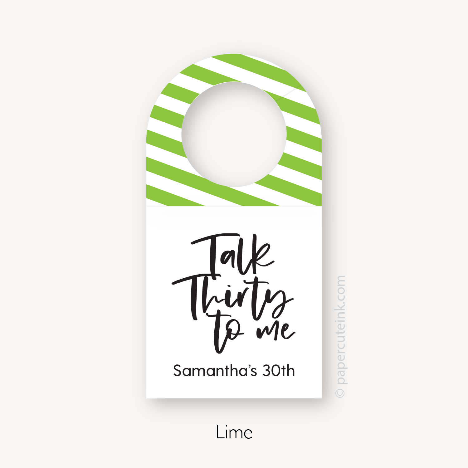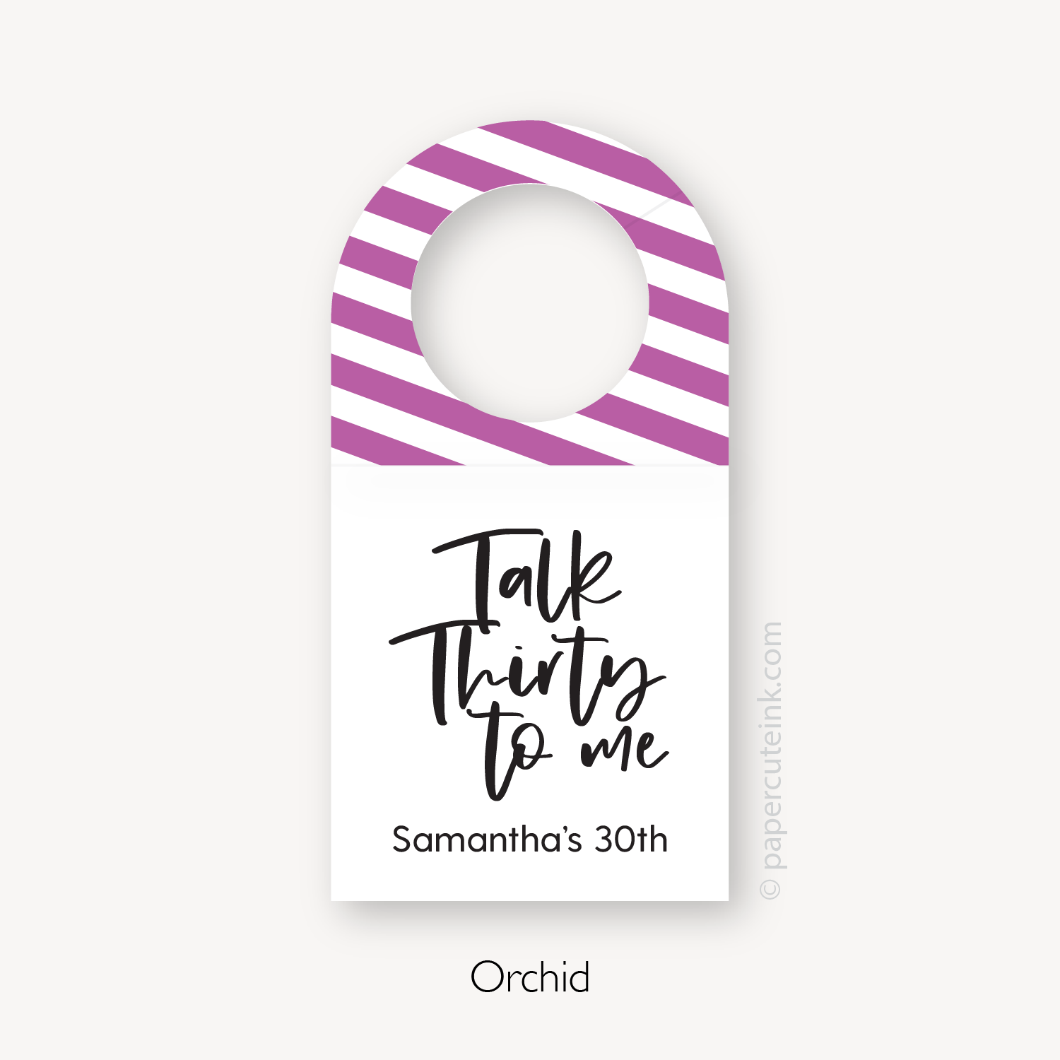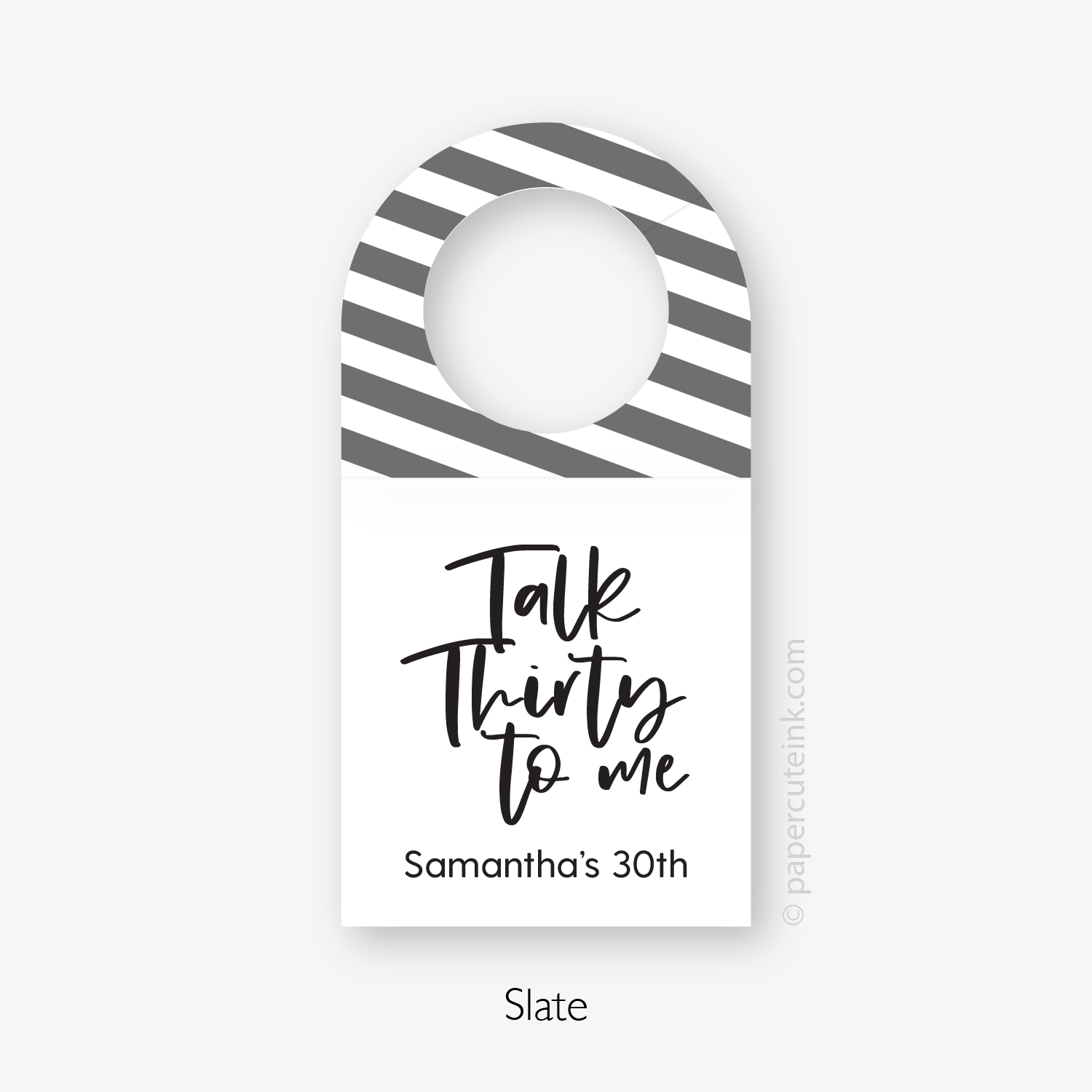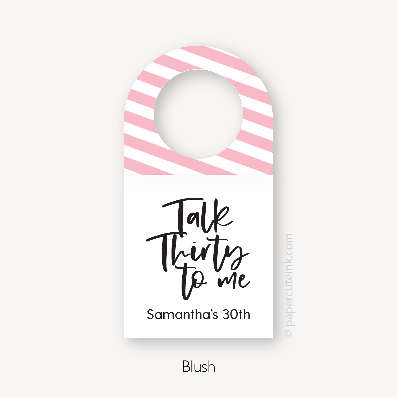 Talk thirty to me 30th Birthday favor tags sized to fit miniature bottles of alcohol. Add these tags to a miniature bottle of your favorite spirits for a party favor that is guaranteed to be a hit with your guests! Personalized with the name of the birthday girl or guy! Sized to fit most 50ml miniature alcohol bottles.